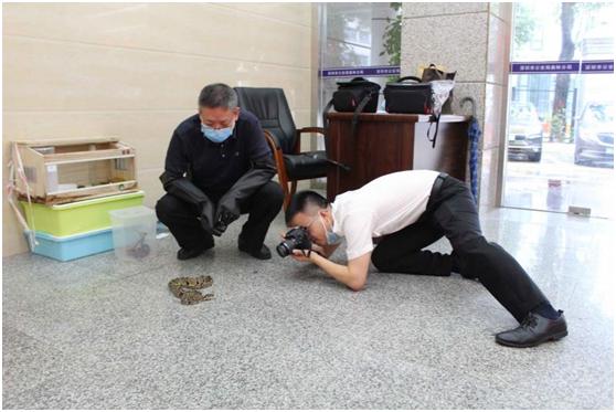 有几次鉴定危险动物蟒蛇和蝮蛇,需要近距离观察瞳孔等细微的鉴定特征,陈老师临危不惧,凭借对蛇习性的了解,让它们乖乖配合检查。这种淡定和从容来自日积月累丰富的专业知识,更来自对野生动物保护这项事业的执着。